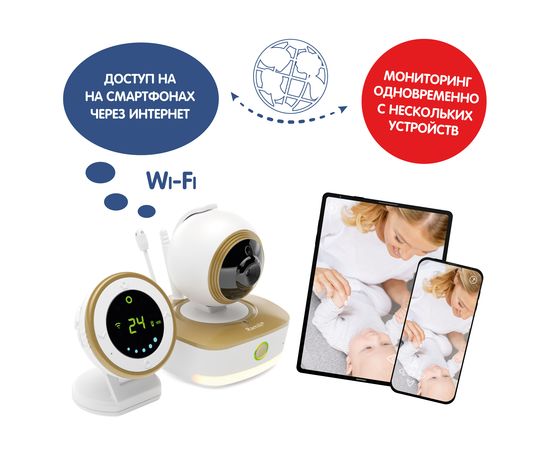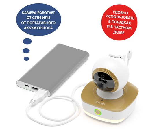 - Двухрежимная камера передает сигнал родительскому блоку и доступна в приложении при подключении к домашнему Wi-Fi.