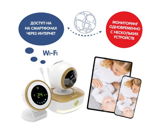 - Двухрежимная камера передает сигнал родительскому блоку и доступна в приложении при подключении к домашнему Wi-Fi.