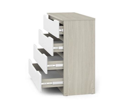Комод с четырьмя вместительными ящиками на бесшумных шариковых направляющих плавного хода.