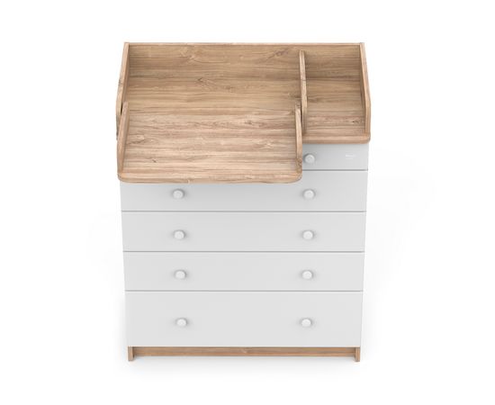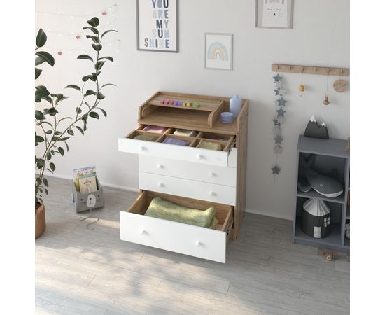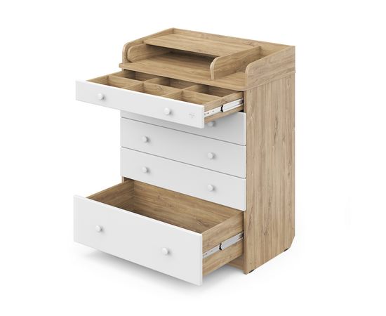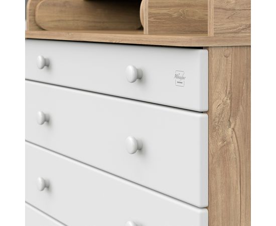 Пеленальный комод Maks - первый из линейки оригинальной дизайнерской детской мебели бренда Mihaylov Design. Элегантный, выполненный в современном стиле и удобный пеленальный комод, в комбинациях контрастных оттенков благородной древесины с нежными, приятными на ощупь, белыми или бежевыми фасадами. В комоде используется пеленальный столик с простым и надежным, скрытым механизмом раскладывания. Есть отделение рядом с пеленальным столиком для средств по уходу за малышом в быстром доступе. Комод очень вместительный, благодаря пяти ящикам, которые установлены на надежные шариковые направляющие бесшумного хода. Нижний ящик большей глубины, а верхний с органайзером для удобства сортировки детских вещей.