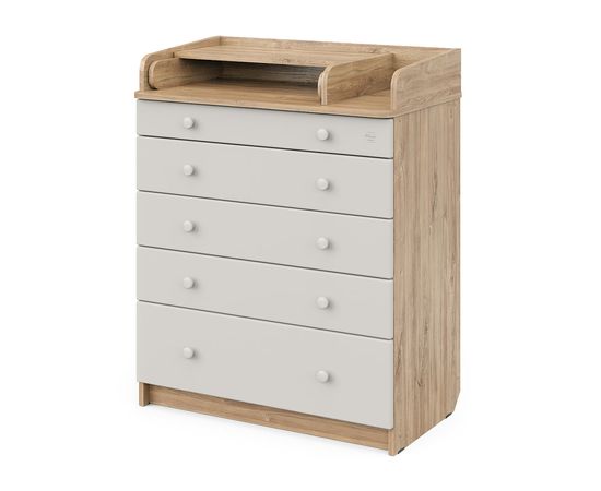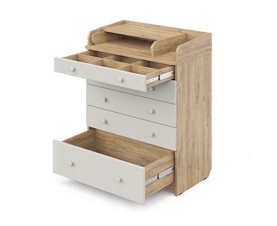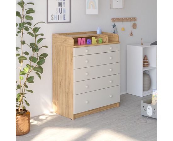 Пеленальный комод Maks - первый из линейки оригинальной дизайнерской детской мебели бренда Mihaylov Design. Элегантный, выполненный в современном стиле и удобный пеленальный комод, в комбинациях контрастных оттенков благородной древесины с нежными, приятными на ощупь, белыми или бежевыми фасадами. В комоде используется пеленальный столик с простым и надежным, скрытым механизмом раскладывания. Есть отделение рядом с пеленальным столиком для средств по уходу за малышом в быстром доступе. Комод очень вместительный, благодаря пяти ящикам, которые установлены на надежные шариковые направляющие бесшумного хода. Нижний ящик большей глубины, а верхний с органайзером для удобства сортировки детских вещей.
