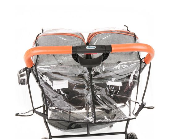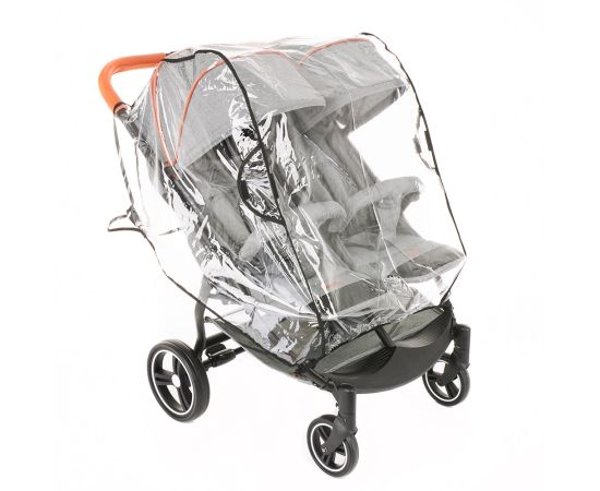 Дождевик на прогулочную коляску для двойни из прозрачной, плотной плёнки. Окошки для проветривания расположены по бокам. Подходит для большинства прогулочных колясок для двойни расположением "рядом", в том числе и с тройной ручкой, благодаря липучке на задней детали. Закрывает коляску целиком, даже в положении "лёжа".