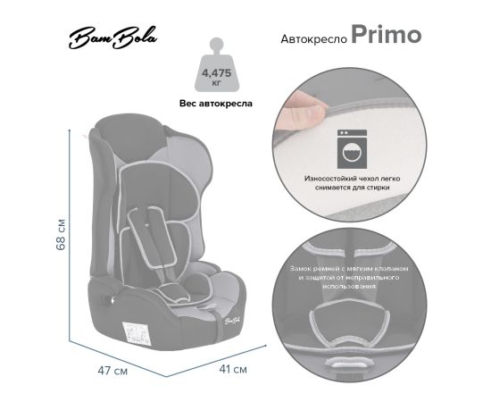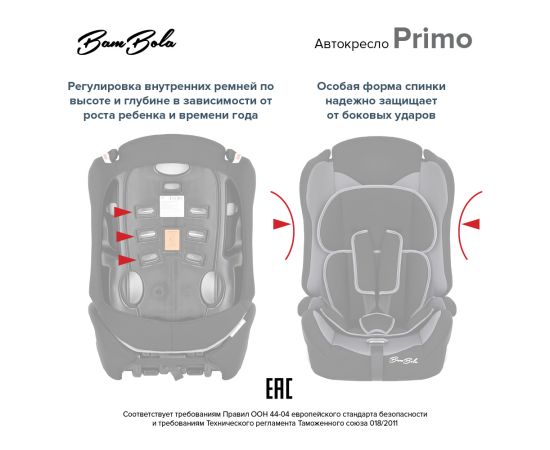 Детское автомобильное кресло Bambola Primo предназначено для детей от 1 года до 12 лет весом от 9 до 36 кг. Отличительным свойством автокресла является его универсальность: по мере роста ребенка, кресло легко трансформируется в бустер. Кресло имеет мягкий съемный подголовник и съемный чехол, изготовленный из гипоаллергенного материала. Для малышей от 1 года до 4 лет автокресло оборудовано внутренними пятиточечными ремнями, которые регулируюся по высоте в зависимости от роста ребенка и по глубине специально под зимнюю одежду.