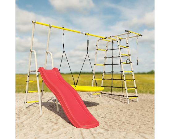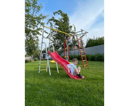Яркий, спортивно-игровой комплекс для детей дополнен замечательной горкой! С 2019 года комплекс поставляется с двумя усиленными качелями на цепных подвесках. Горка выполнена из качественного польского пластика, товар сертифицирован и безопасен. Комплекс Богатырь произведен на заводе игрового оборудования Romana — ведущем российском производителе детского игрового оборудования. Вся продукция проходит заводские испытания, также проверена уже многолетней эксплуатацией у покупателей. Уличное оборудование выполнено из металла не менее 4 мм, покрыто специальной антикоррозионной атмосферной краской, все детали и навесные снаряды сделаны специально для использования на улице и не подвержены атмосферному воздействию.
