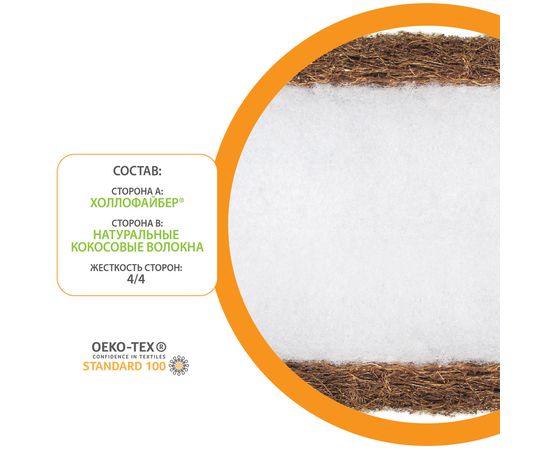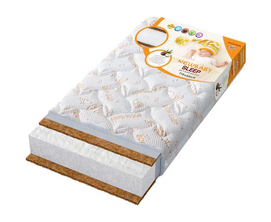 Кокос относится к линейке оптимально-жестких, дышащих наполнителей высокой упругости, обладает необходимой жесткостью и прекрасно сопротивляется сжатию. Кокосовая койра, скрепленная натуральным латексом, не только не теряет дышащих свойств кокоса, но и значительно повышает упругость и эластичность и создает ортопедический эффект.Благодаря равномерному распределению давления, сон на матрасе NewBaby «Sleep» благоприятно скажется на формировании позвоночника и мышц ребенка, избавит от опасности раздражения и аллергии, ведь в холлофайбере не развиваются болезнетворные бактерии микроорганизмы, а значит, полноценному отдыху Вашего малыша ничто не помешает.Холлофайбер® - это упругий дышащий гипоаллергенный наполнитель с уникальной структурой волокон, которые работают по принципу всем известных пружинных матрасов, т.е. создают идеальную, устойчивую к сминанию и деформации поверхность для сна. Роль пружин в Холлофайбере® выполняют инновационные, полностью безопасные полиэфирные волокна в форме вертикальных спиралек, с прекрасной циркуляцией воздуха и влаги. Матрас NewBaby «Sleep» обладает уникальной многослойной конструкцией – в его основе плита из Холлофайбера®, а обе стороны выполнены из латексированных волокон кокосовой койры.Главные особенности