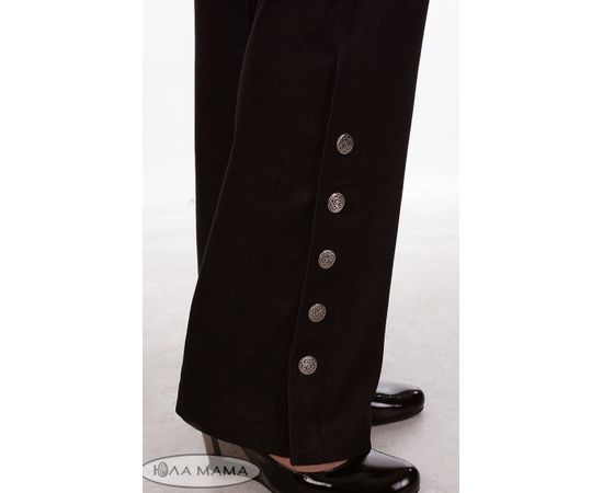 Брюки прямые из костюмной ткани с начесом, кокетки на полочке и спинке со шлевками, пояс с кнопками, по голенищу шлица с кнопками, карманы на змейке, пояс трикотажный с фиксатором.