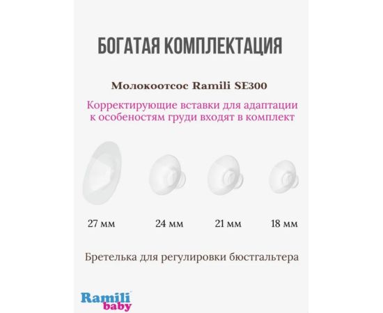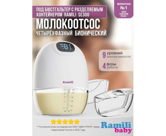 Современный и технологичный молокоотсос Ramili SE300. Молокоотсос Ramili SE300 создан на основе тщательных исследований потребительского мнения мам и в сотрудничестве с практикующими экспертами в области грудного вскармливания. В этом молокоотсосе воплощены самые передовые технологии известного производителя Ramili Group, специализирующего на производстве товаров для мам и малышей. Это надёжный молокоотсос, изготовлен из современных безопасных материалов. Ramili SE300 исправно прослужит вам на протяжении всего периода грудного вскармливания малыша.