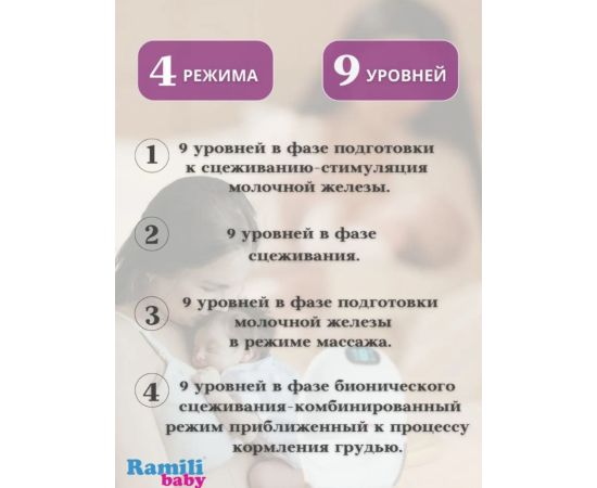 - 9 уровней в фазе бионического сцеживания – комбинированный режим приближенный к процессу кормления грудью.