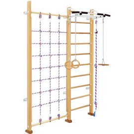 В нашем магазине вы найдёте широкий выбор деревянных шведских стенок и домашних спорткомплексов различной комплектации: с турниками, канатами, кольцами, верёвочными лестницами и горками. Все модели изготавливаются из высококачественной древесины — чаще всего это берёза или сосна — с соблюдением всех норм безопасности. Натуральное дерево не вызывает аллергии, приятно на ощупь и отличается долговечностью.
