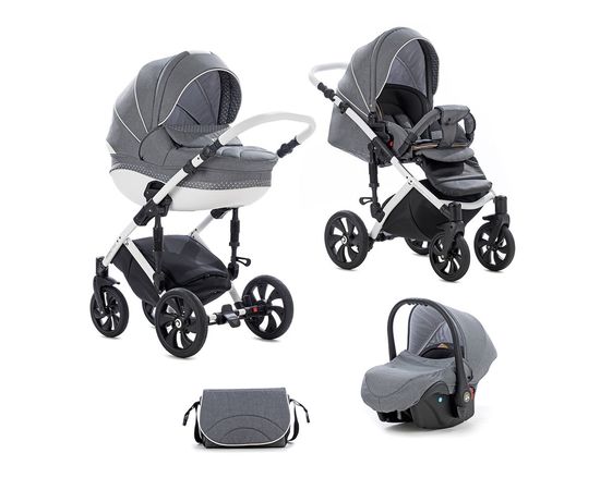 Коляска Tutis 3в1 Mimi Style Серый лен+ белый горох+ кожа (Белая рама)