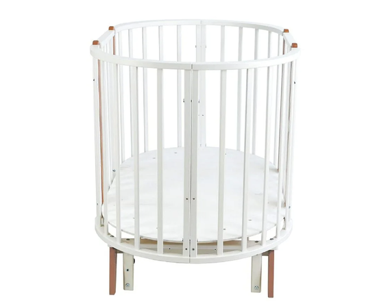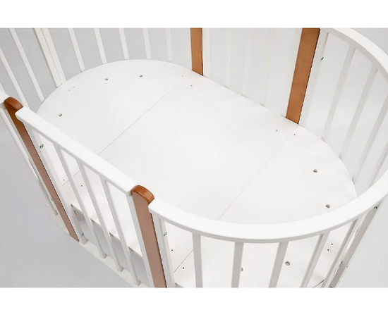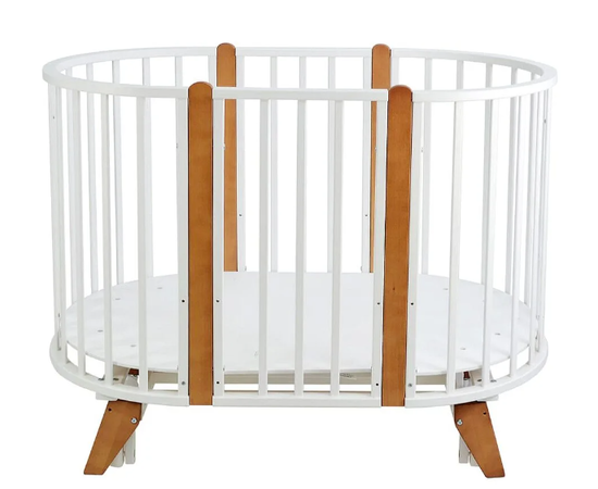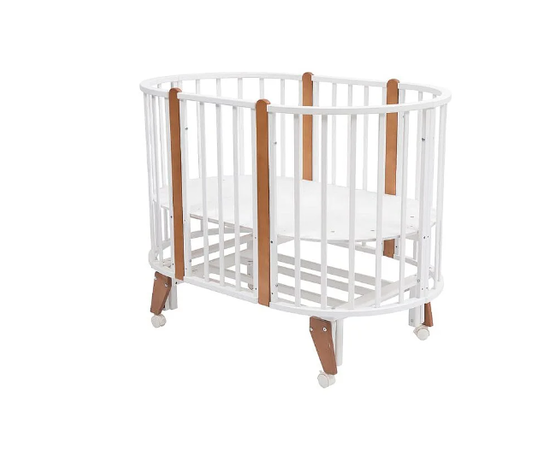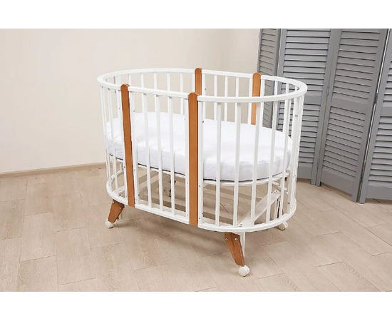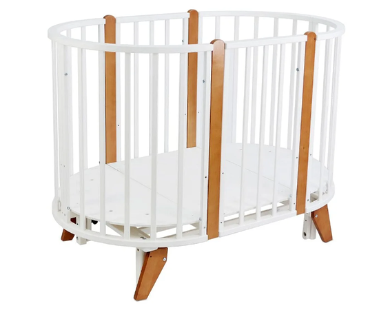 Маятник и колёса в комплекте! Экологичная овальная кроватка-трансформер для новорожденного выполнена из отборной древесины березы и прочного МДФ. Детская кровать покрыта нетоксичными гипоаллергенными лаками и красками на водной основе.