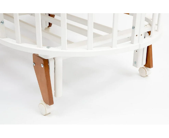 Кровать можно устанавливать на ножки или на колеса. В комплекте 4 колеса с возможностью фиксации и установки в различных положениях (для круглой и овальной кроватки).