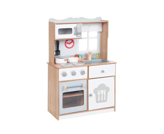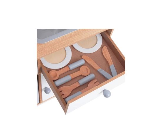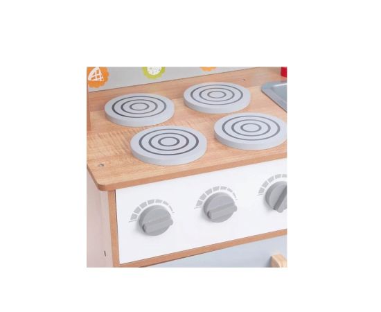 Плита и духовка с регуляторами, секции для хранения, мойка с современным смесителем, держатель для полотенца.