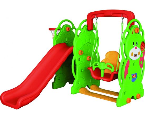 В наборе качели, оборудованные для безопасности малыша бампером и баскетбольное кольцо для игры с мячом.