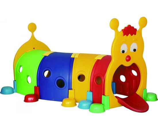 Игровой туннель в виде яркой разноцветной гусеницы. Подходит для установки во дворах жилых кварталов, а также в просторных закрытых помещениях (например, в детском саду или игровых комнатах).