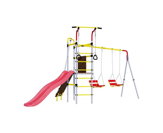 Комплектация: качели со спинкой, горка, канат, гимнастические кольца