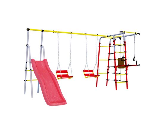 В дачном спортивном комплексе ROMANA «Богатырь Плюс» предусмотрено много возможностей для спортивных занятий маленьких богатырей. Здесь и лестница, и турник, и брусья, и гимнастические кольца, а также небольшой канатный лаз из шнура повышенной прочности. Вторая часть комплекса — это удобная и безопасная горка. Части соединены надежной металлической перекладиной, которая испытывается нагрузкой в 200 кг.