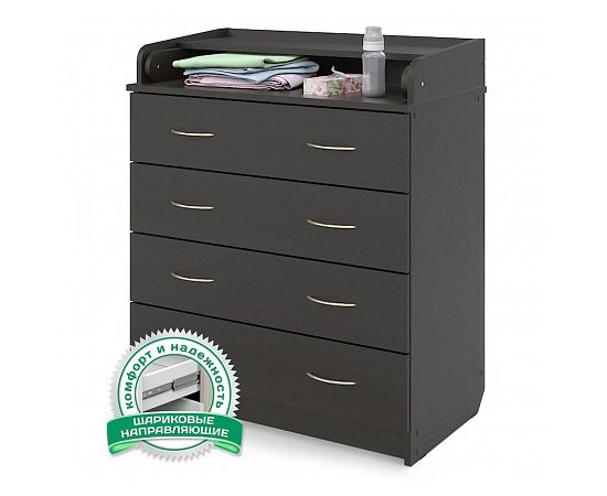 Комод оборудуется 4-мя вместительными выдвижными ящиками. Фурнитура, применяемая для сборки мебели, обеспечивает долгую, надежную работу всех подвижных частей конструкции.
