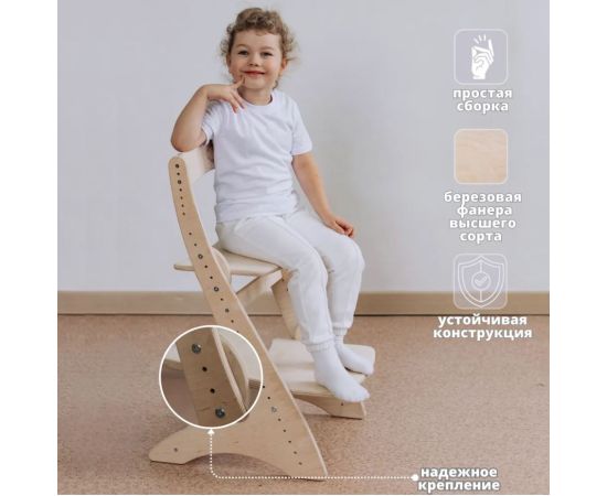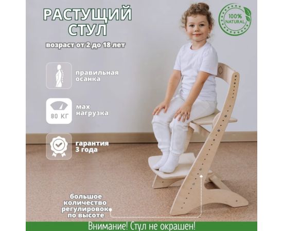 Стул не окрашен, то есть вы можете придать ему любой цвет по своему усмотрению. Растущий стул предназначен для детей с двух лет и до совершеннолетия. Растущий стул детский помогает Вашему ребенку сидеть за столом с правильной осанкой, что служит профилактикой появления сколиоза.