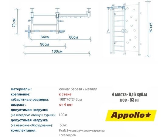Один компактный снаряд дает необъятную площадку для спортивных игр! Те, кто хоть раз карабкался по скалодрому, знают: это безумно увлекательно, а также у Вашего малыша активируется работа всех мышц. Поэтому детям никогда не надоедает забираться вверх по отвесной стене. Домашний спортивный уголок выполнен из березы и сосны.