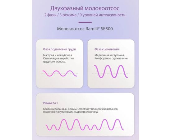 Ramili SE500X2 имеет две фазы: подготовка груди и сцеживание. В каждой фазе по 9 уровней интенсивности. Благодаря этому и другим конструктивным особенностям ритм сцеживания максимально приближен к ритму ребенка. А процесс сцеживания в целом максимально приближен к процессу естественного кормления грудью, только без болевых ощущений и прочих возможных последствий, что очень важно для женского здоровья.