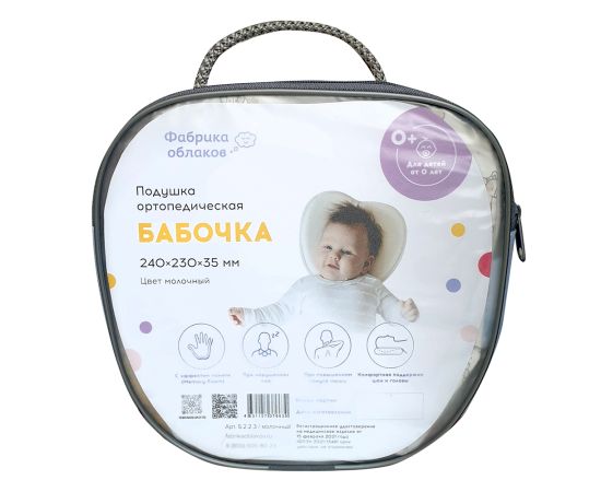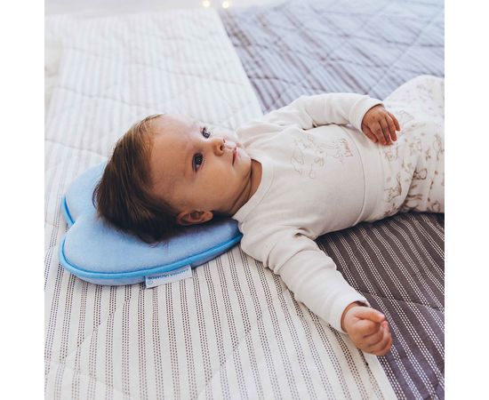 Подушка для новорожденных имеет форму бабочки с отверстием для затылка по центру. Подушка предназначена для сна младенцев на спине с рождения до 6 месяцев.