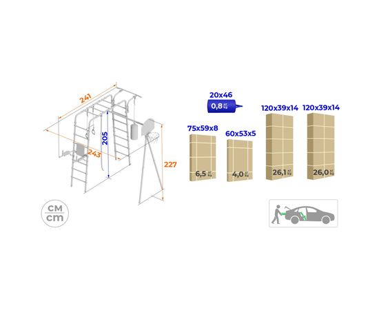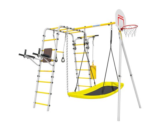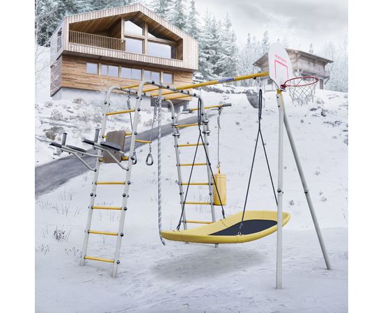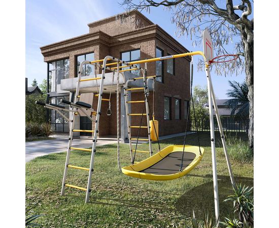 Функциональность комплекса обеспечивает множество дополнительных игровых элементов. В комплект входят: баскетбольный щит, груша, брусья, канат, кольца с перекладиной, гимнастическая лестница, рукоход, подвижный турник. Возможность регулировать турник по высоте позволяет подобрать комфортный уровень для ребенка. Комплект можно дополнить сеткой лазом и качелями разных видов. Множество элементов создают условия для всестороннего развития ребенка, занятия на комплексе развивают силу, ловкость, выносливость, координацию и моторику.