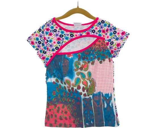 Футболка Nova с вырезом на груди 128см - расшита пайетками, необычный и яркий рисунок на передней части. Очень нарядная и красивая! 95% хлопок, 5% спандекс.