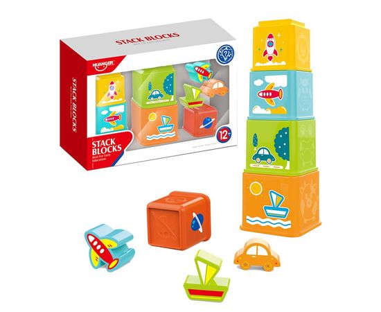 На каждом ведерке изображено какое-нибудь транспортное средство. Ведерки вкладываются друг в друга по принципу матрешки, а также складываются пирамидкой. Также в набор входит три фигурки транспорта.