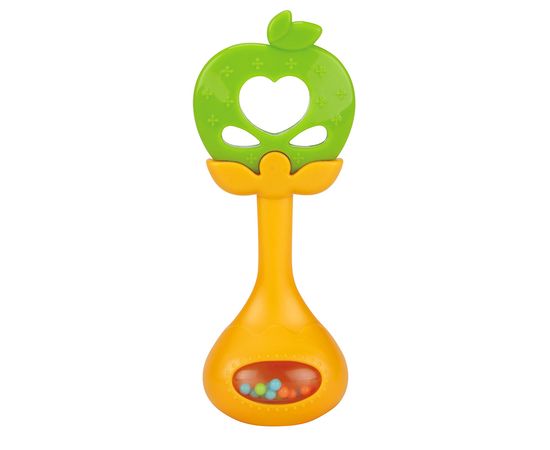 Погремушка с прорезывателем «ЯБЛОЧКО» в виде яркого фрукта для маленьких детей, у которых режутся зубки. Яркие цвета привлекают внимание малыша. Если потрясти погремушку, то в прозрачном шарике будут перекатываться цветные бусины.