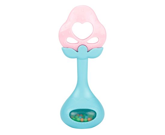 Погремушка с прорезывателем «ЗЕМЛЯНИЧКА» в виде яркого фрукта для маленьких детей, у которых режутся зубки. Яркие цвета привлекают внимание малыша. Если потрясти погремушку, то в прозрачном шарике будут перекатываться цветные бусины.