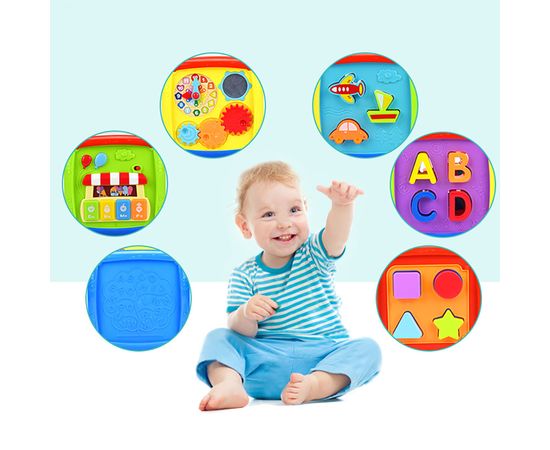 На домике расположено множество всевозможных элементов, которые можно двигать, крутить, щелкать, открывать. Эта игрушка направлена на развитие моторики, зрительного восприятия, установление причинно-следственных связей.