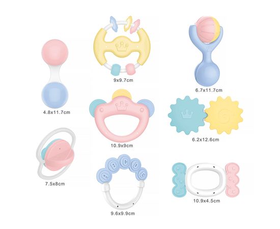 В упаковке 8 разных Прорезывателя-Игрушки-Погремушки шириной от 45мм до 95мм и длиной от 95мм до 125мм.