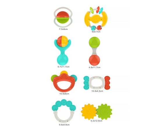 В упаковке 8 разных Прорезывателя-Игрушки-Погремушки шириной от 45мм до 95мм и длиной от 95мм до 125мм.