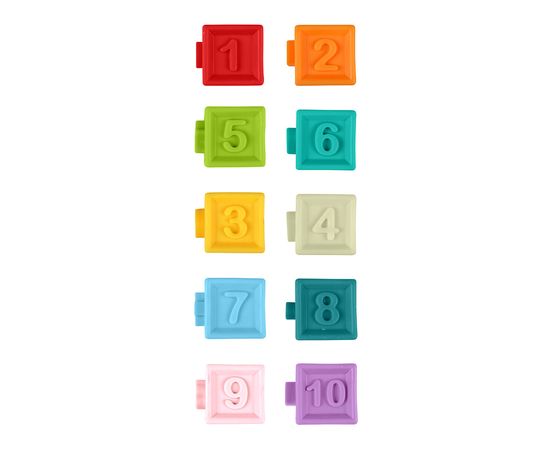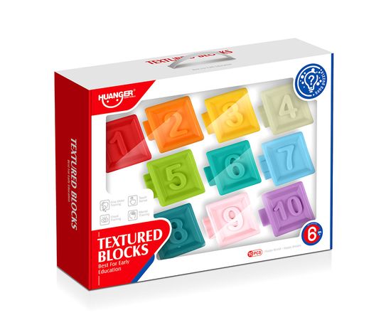 В комплект входят 10 кубиков с различными рельефными элементами.