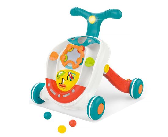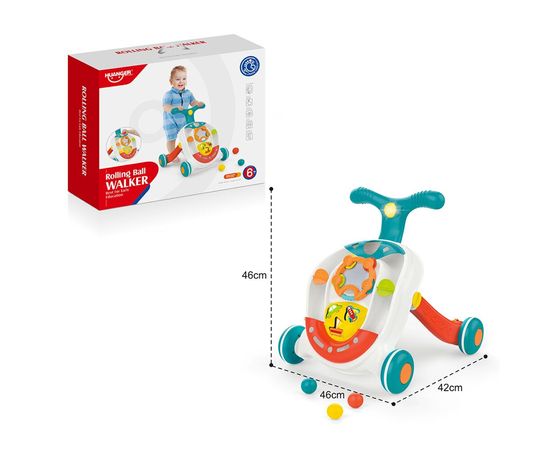 Каталка оснащена ручкой, с помощью которой ребенку будет удобно возить ее по дому или на улице, а в процессе он будет развивать координацию, моторику, равновесие, и его движения станут более четкими.