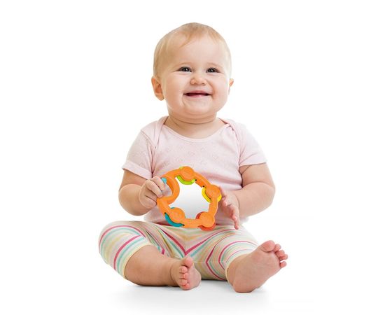 На корпусе каталки есть вращающиеся элементы и бубен с зеркальцем, бубен снимается, удобно держать его за ручку. Если бубен потрясти, он будет издавать звук.