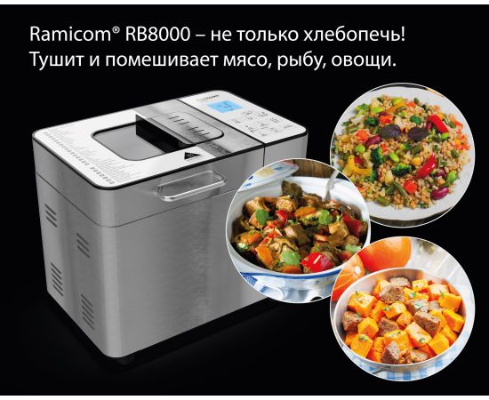 В хлебопечке Ramicom RB8000 можно не только приготовить хлеб или джем. В режиме программы номер 16 можно потушить мясо, рыбу, овощи. Например, вы можете без лишних хлопот приготовить курицу с картофелем или рыбу с овощами. В процессе приготовления хлебопечка самостоятельно помешивает еду, а антипригарное покрытие нового поколения позволяет готовить здоровую пищу с минимальным количеством масла или вовсе без него в зависимости от блюда. Оптимально для приготовления 2-3 порций.