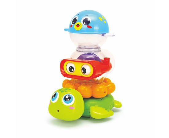 В набор входят: рыбка, которая разбирается на две чашечки, осьминог с присоской, может крепиться на стену ванной, вращает глазами при наполнении водой, маленькая черепашка брызгается водой и крутится.