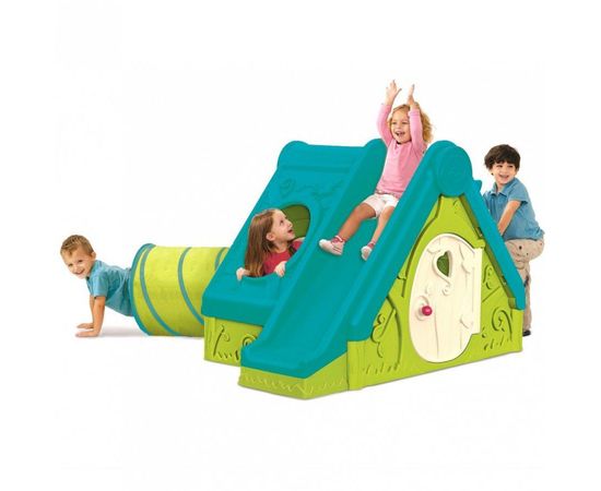 Детский домик с горкой Фантивити изготовлен из крепкого пластика с защитой от ультрафиолетового излучения. Очень удачное решение — разместить на крыше домика лестницу и горку. Дети могут и кататься с горки и играть в домик. Второе важное дополнение к домику — тоннель.