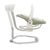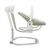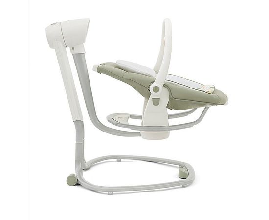 Посадочное место изменяет направление при движении рук. Над крохой располагается дуга с игрушками, которые способствуют развитию тактильных ощущений и первичного восприятия мира. Качели имеют мягкую обивку, вкладыш для спинки, встроенные ремни против выпадения. На основании имеются два колеса для быстрого перемещения пустых качелей по комнате.
