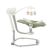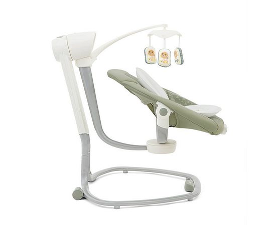 Посадочное место изменяет направление при движении рук. Над крохой располагается дуга с игрушками, которые способствуют развитию тактильных ощущений и первичного восприятия мира. Качели имеют мягкую обивку, вкладыш для спинки, встроенные ремни против выпадения. На основании имеются два колеса для быстрого перемещения пустых качелей по комнате.