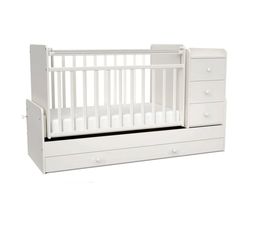 Кроватка трансформер с 0-10 лет Tomix Freddo Белый Кроватка для новорожденных растёт вместе с ребёнком. С рождения- кроватка-манеж 120х60 см с поперечным маятником для укачивания, пеленальным комодом с 3 ящиками и большим ящиком под кроватью. Кроватка с силиконовыми накладками-грызунками...