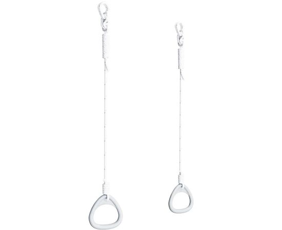 Гимнастические кольца выполнены из пластика. Легкие кольца не имеют неровностей или зазубрин, что делает кольца менее травмоопасными и наиболее удобными для детей. Прочные тросы диаметром 10 мм. Металлические фиксаторы для регулировки длины.