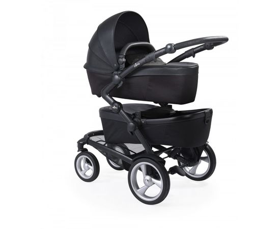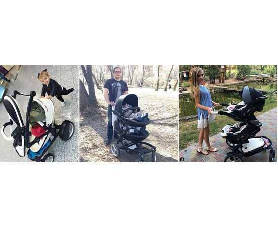 В этой коляске объединились два прогулочных блока и люльки, спрятанные в блоки. Чтобы превратить блок в люльку его достаточно расстегнуть молнию по периметру блока. На шасси можно установить два автокресла группы 0+. В любом месте эта компактная элегантная коляска будет привлекать себе внимание.