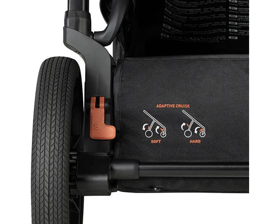 Регулируемая подвеска. Запатентованная независимая система регулировки подвески на каждом колесе обеспечивает оптимальный комфорт для ребенка в любой фазе его роста. Корректировка в зависимости от веса ребенка. Задняя подвеска в мягком режиме рекомендуется, когда ребенок еще совсем маленький. Жесткий режим рекомендуется, когда ребенок старше. Корректировка в зависимости от типа местности. Передняя подвеска в мягком режиме идеально подходит для преодоления пересеченной местности. Жесткий режим подходит для гладких поверхностей.