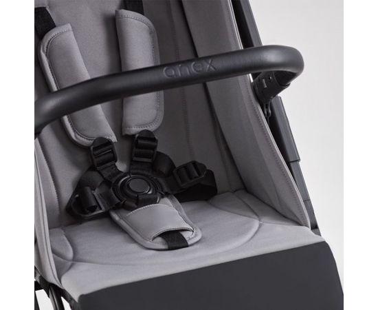 Надежная гарантия от внезапного выпадения малыша из коляски Anex – тандем бампера и пятиточечных ремней с мягкими накладками на зону плеч и паха. Ремни необходимо отрегулировать по высоте, исходя из роста ребёнка. Бампер покрыт эко-кожей, на которой выбит логотип бренда. Для максимального удобства бампер является поворотно-откидным.