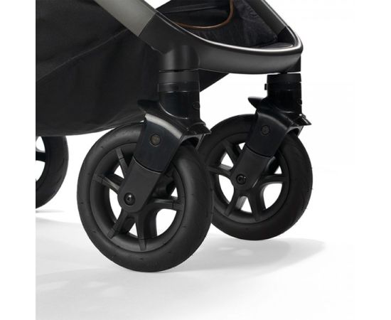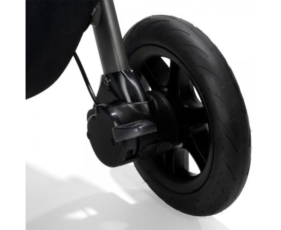 Колёса Joie Finiti Signature псевдо надувные. Они не боятся проколов, не нуждаются в подкачке, но создают ощущение пневматики и отлично гасят вибрацию от дороги. Передние колёса можно зафиксировать в положении прямо, это повысит проходимость коляски и позволит катить её даже по рыхлому снегу или песку. Тормоз расположен у правого заднего колеса, его легко нажимать. Обратите внимание, что на заднем шасси нет перекладины, а это значит, вы никогда не заденете коляску при ходьбе!
