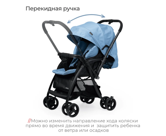 Коляска с перекидной ручкой. Благодаря перекидной ручке вы можете менять направление движения коляски прямо во время прогулки, защищая ребёнка от ветра и дождя.