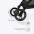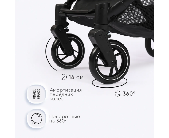 - Поворотные передние колеса с амортизацией диаметром 14 см, задние колеса – 16 см;
